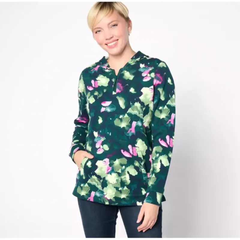 A quarter zip is just what you need for an extra layer of warmth and style. The hood keeps you even cozier, while the side pockets have an inner kangaroo pocket for added convenience. From Denim Co.® Fashions.