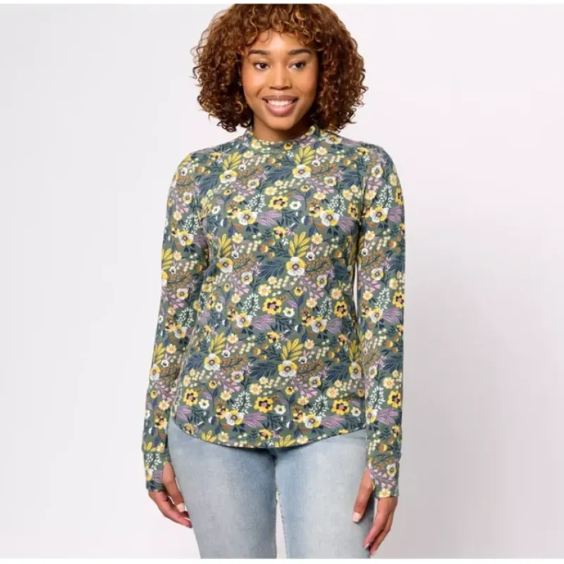 - Features: allover print, mock neck, long sleeves with thumbhole, curved bottom hem