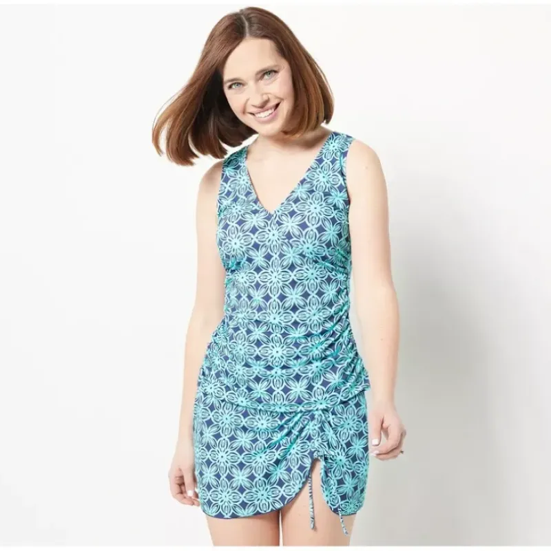 - Top Features: V-neckline, surplice tank, shirring at side seams to burst, UPF50