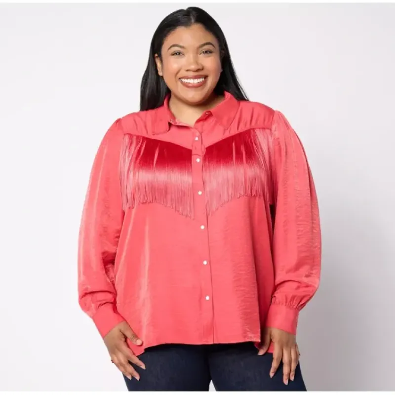 Rolling out to the rodeo or keeping up your heels line-dancing, this button-front fringe blouse is ready for any adventure. Reach for this western-inspired style whenever you want to energize your outfit with playful personality. From American West.