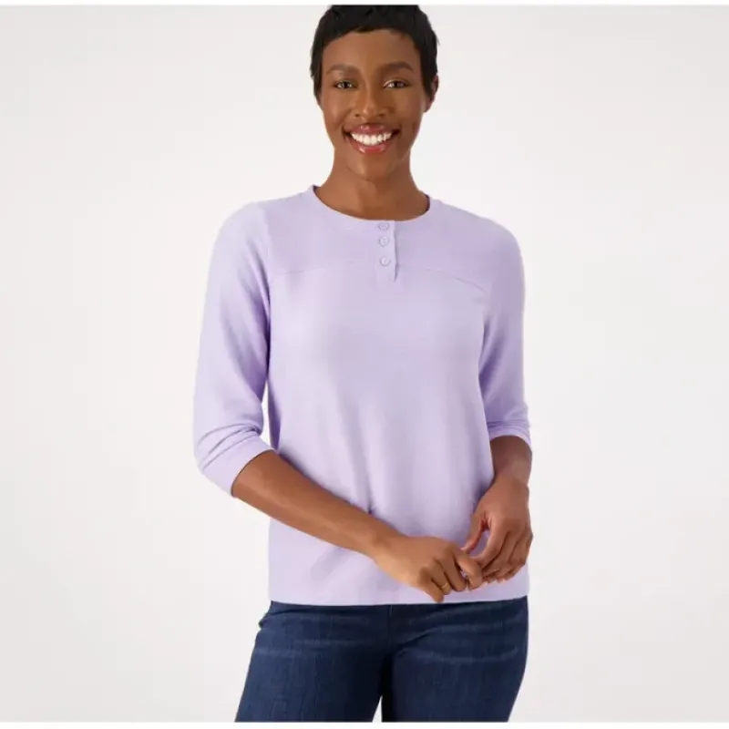 - Features: henley design, two-ply set in neckband with self placket with buttons, front curved yoke details, 3/4-length sleeves, straight hem bottom