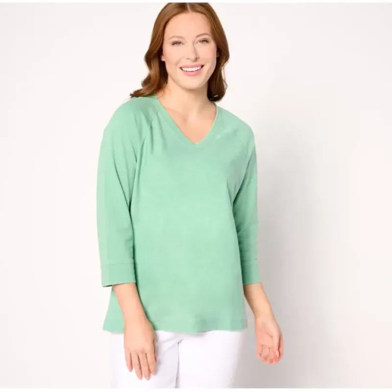- Features: beach wash, V-neckline, 3/4-length raglan sleeves, hi-low hem