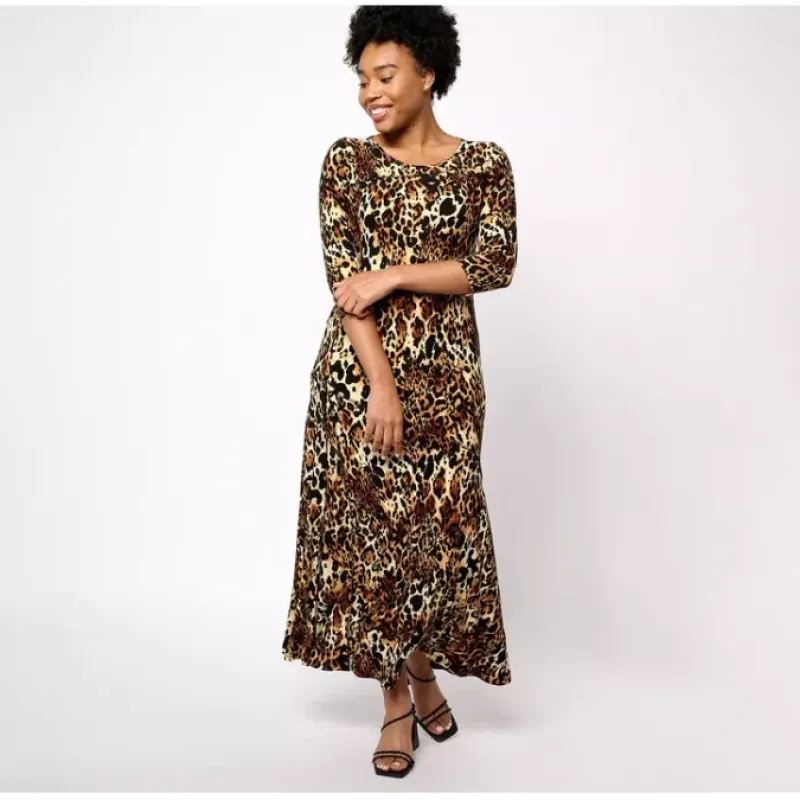 - Features: allover print, 3/4-length sleeves, asymmetric-seamed front, godets, maxi-length