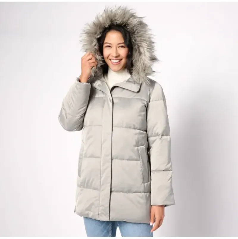 - Features: removable hood with faux-fur collar, hidden snap placket, welt pockets