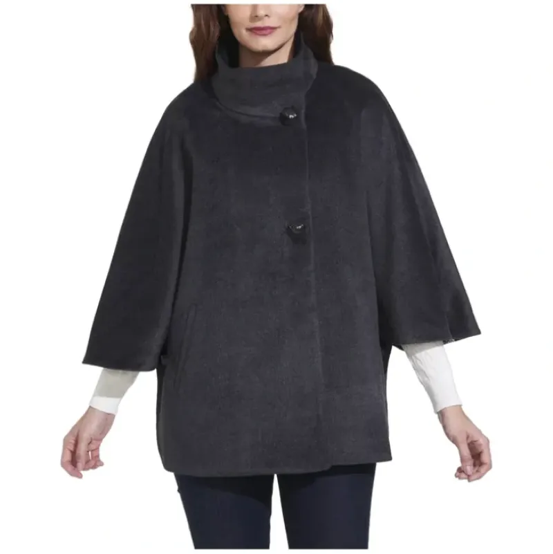 - Features: poncho style, funnel-neck collar, button-front closure, center-back vertical seam, two functional welt pockets
