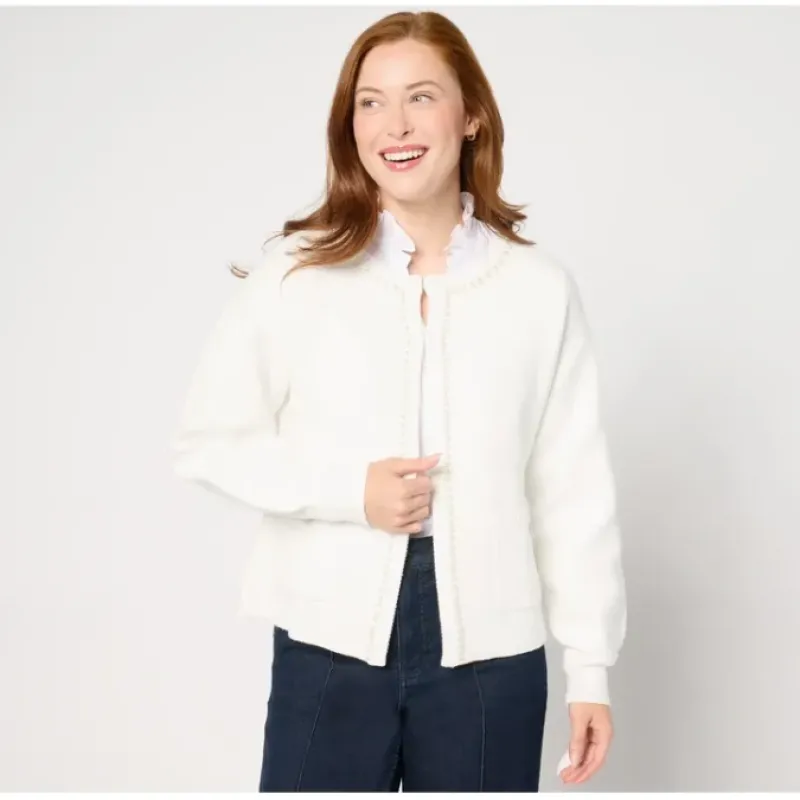 Not just another cardigan, this pretty option is fashioned with faux pearls along the trim and ribbing details at the neckline, placket, pockets, sleeve openings, and hem. From Studio ParkTM x Amy Stran.