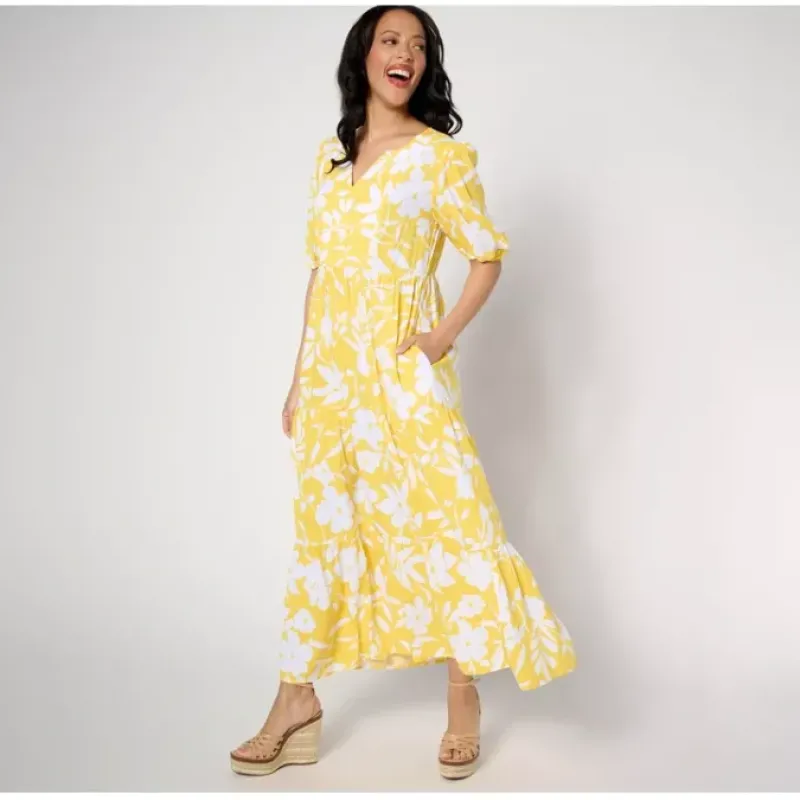 - Features: allover print, maxi length, split V-neckline, elbow-length sleeves, shirred sleeve caps and bottom tiered skirt seam, elastic cuffs, side-seam pockets