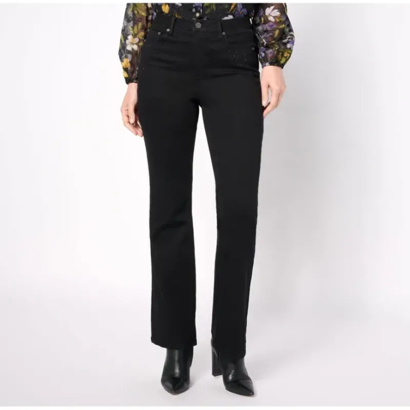 Your seasonal jeans forecast: a dusting of sparkle! Embellishment turns an otherwise-classic boot-cut pair into something a bit more dramatic, dressy-ish, and party-perfect. From Susan Graver.