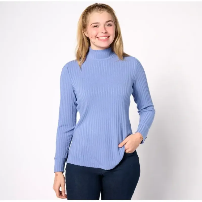 Experience the luxurious comfort of this gorgeous mock-neck top. Fashioned with a button detail at the cuffs, this top is great for all those special occasions. From Belle by Susan Graver.