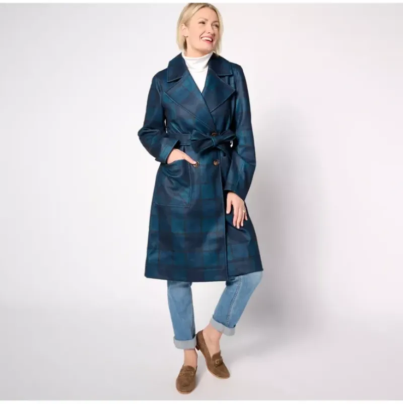 - Features: allover pattern, double-breasted, button-front closure, notch collar, back flap, patch pockets, self-tie belt