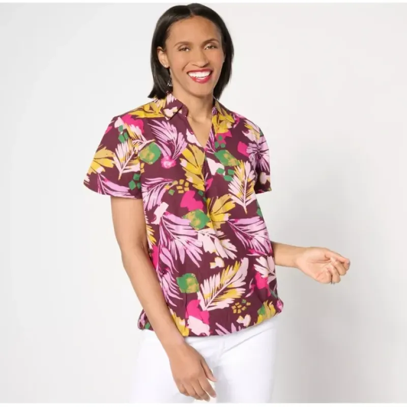 Slay an always-on-vacay vibe with this tropical palm-printed top. Feel the sun on your skin and the sand between your toes — even if you destination is only as far as the backyard. From Denim Co.® Fashions.