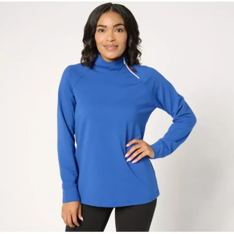 Add some playful pizzazz to your casual options with this French terry top featuring a two-piece mock neckline with an asymmetrical zip shoulder detail. From Denim Co.® Fashions.