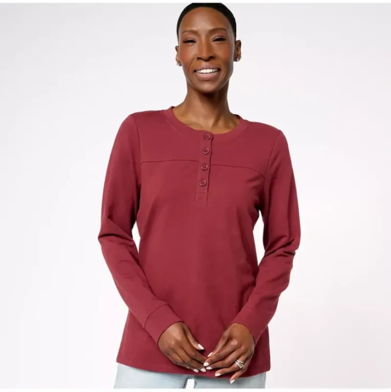 Give your weekend wardrobe a boost with this stylish pullover that features four buttons on the front. From Denim Co.® Fashions.