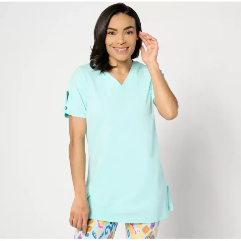 Ready for an active summer? Whether you’re endlessly on the go or just actively chilling out, this cuter-than-cute tunic with keyhole detail on the sleeves offers cotton-rich construction to feel comfortable in hotter temps plus lots of stretch to flex with your day. From Denim Co.® Fashions.