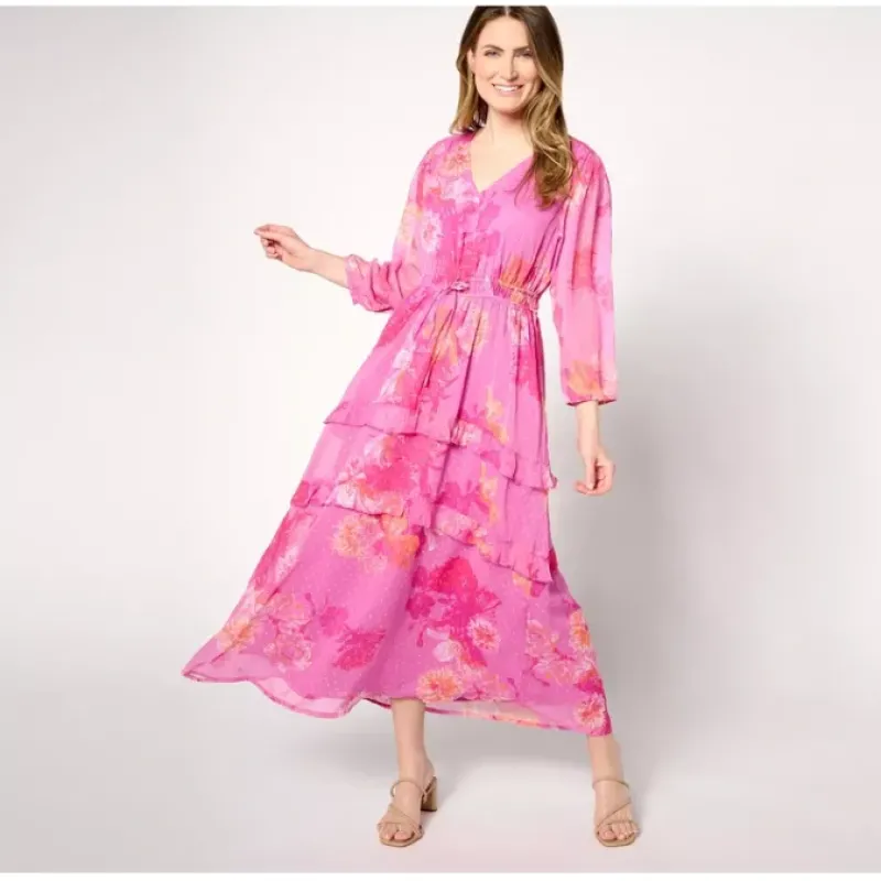- Features: allover floral print, clip dot chiffon shell, V-neckline, shirring at shoulder, long sleeves with elastic cuff, tunneled elastic waistband with drawcord, pockets, ruffled tiers, fully lined