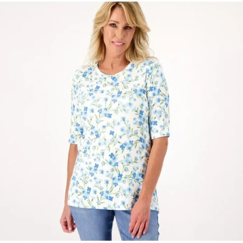 - Features: ribbed, printed, scoop neckline, short sleeves