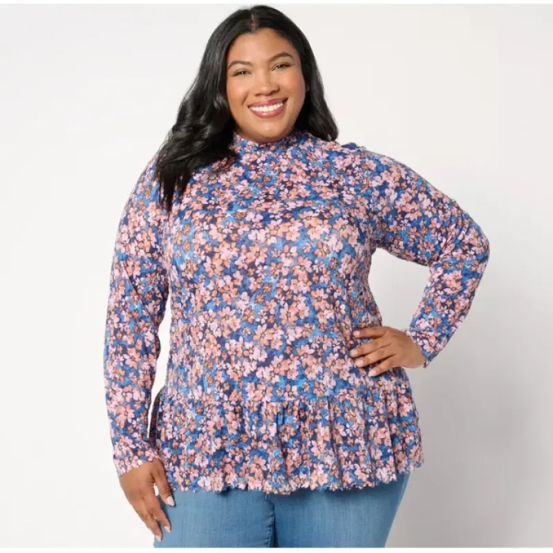 Freshen up your everyday options with this mock neckline top, designed with a shirred drop waist and scalloped hem to create subtle movement and maximum style. From LOGO by Lori Goldstein®.