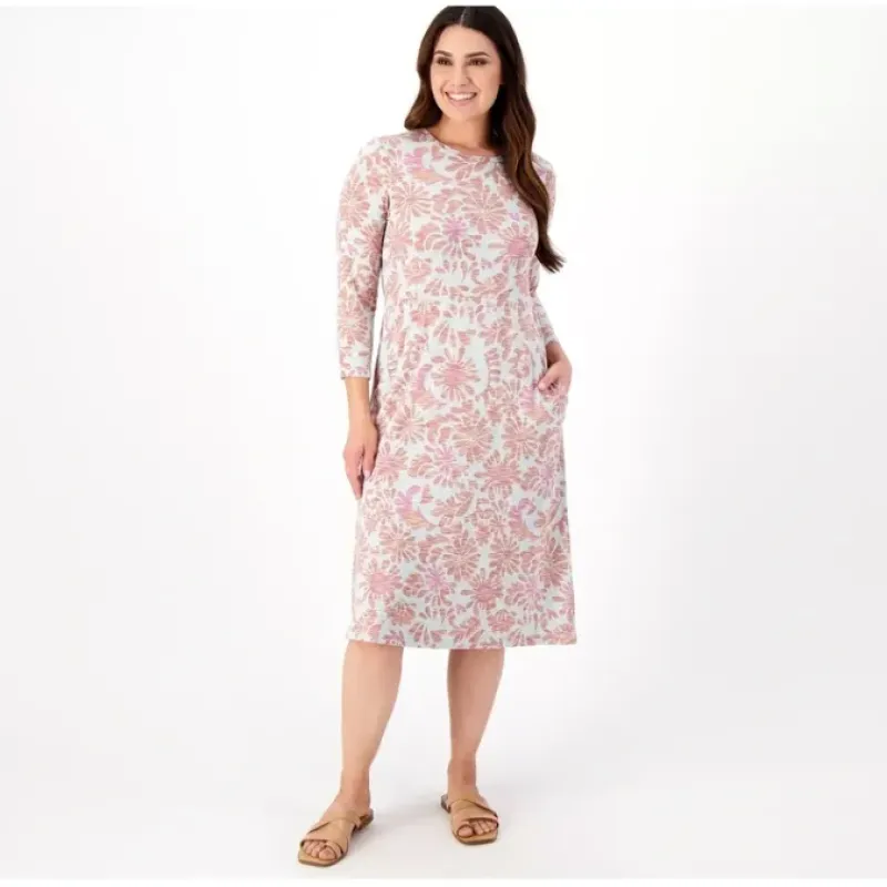 - Features: crew neckline, tiered design, 3/4-length sleeves, on-seam pockets, hi-low hem, allover print