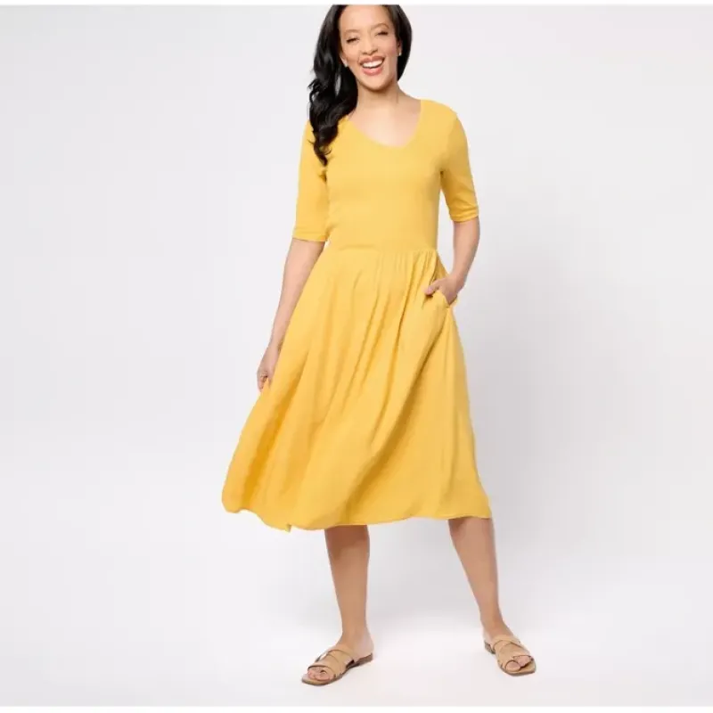 - Features: asymmetric V- shape neckline, encased elastic in waist seam, side-seam pockets, princess seaming on bottom skirt body
