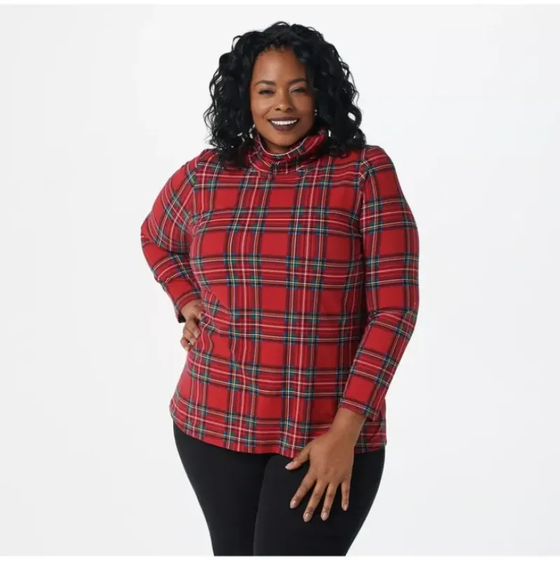Not just your ordinary turtleneck, Denim Co.’s Printed Perfect Jersey Turtle Neck Top can help add more character to your cold-weather wardrobe. Its material is cotton-rich with a little bit of spandex, helping it offer both comfort and flexibility. Thick enough to keep you toasty through the fall and winter — but flexible enough to be layered for added warmth and outfit versatility — this turtleneck is a classic. Thanks to its plaid pattern, it can even serve as a statement piece all on its own! Offering a high-end look at a fraction of the cost, the Printed Perfect Jersey Turtle Neck Top is a stylish must-have for your seasonal wardrobe. From Denim Co.® Fashions.