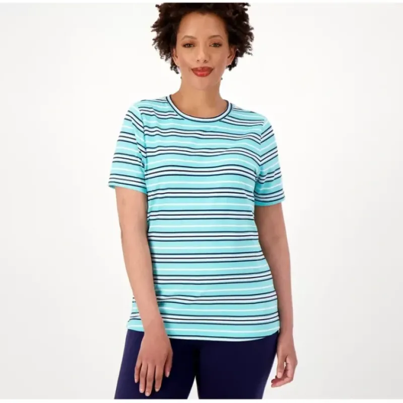 - Features: allover stripe, round neckline, short sleeves, side slits