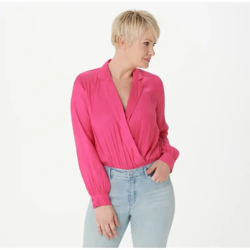 That blousy, ultra-chic, tucked-in look can be hard to achieve (and maintain) with a regular top and unruly hem. The solution? This elegant bodysuit from StyleList by Micaela. With a collared wrap-style top that always appears tucked just right and a thong gusset with cotton for comfort, it makes a believer of even the most bodysuit-shy among us. From StyleList by Micaela.