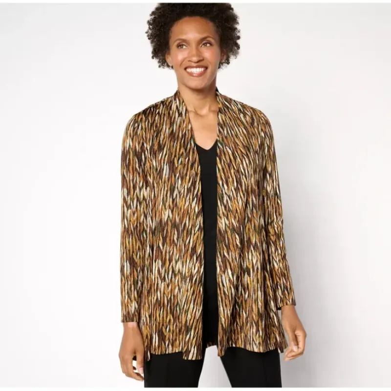 Why not wear now wear later? This novelty knit’s comfortable year-round weight and irresistibly rich print has us dressing up in this cardi as soon as the package arrives — and factoring it into our fall/winter rotation. From Susan Graver.
