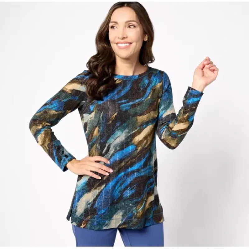 Arrange the charcuterie, put on the playlist, and pop the bubbly. This joyful metallic tunic calls for a celebration. From Susan Graver.