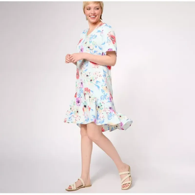 Flirty and feminine, this printed dress wows with a hi-low ruffle hemline. Pair it with your favorite wedges and chic sunglasses and face the summer in style. From the Tolani Collection.