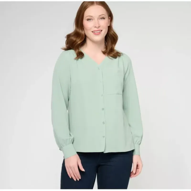 - Features: long sleeves with cuff button and vent, V-neckline. button-front placket, bust darts, forward shoulder seam with gathering, chest pocket, back yoke with shirring