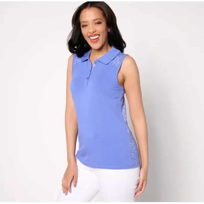 Whether it’s time to hit the links or catch up with an old friend at the coffee shop, this sleeveless golf tank top is a sporty option you’ll love. With a solid front and a printed back, this collared top looks good from every angle. Score! From zuda®.
